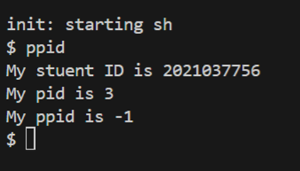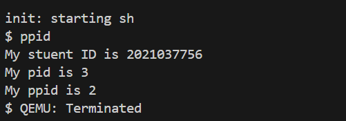 구현을 마쳐주고, make qemu 명령어로 xv6를 실행시켜준다. 그리고 ppid 명령어를 입력해 주면 아래와 같이 조건에 맞게 잘 실행되는 것을 볼 수 있다.