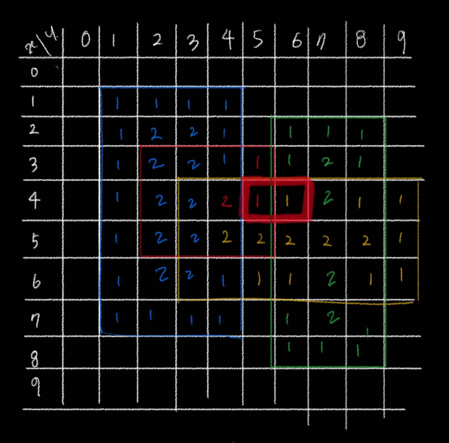 Rectangular 배열이 " [[1,1,7,4], [3,2,5,5], [4,3,6,9], [2,6,8,8]] "로 주어진 경우를 그려보면 아래 그림과 같이 표기할 수 있다.