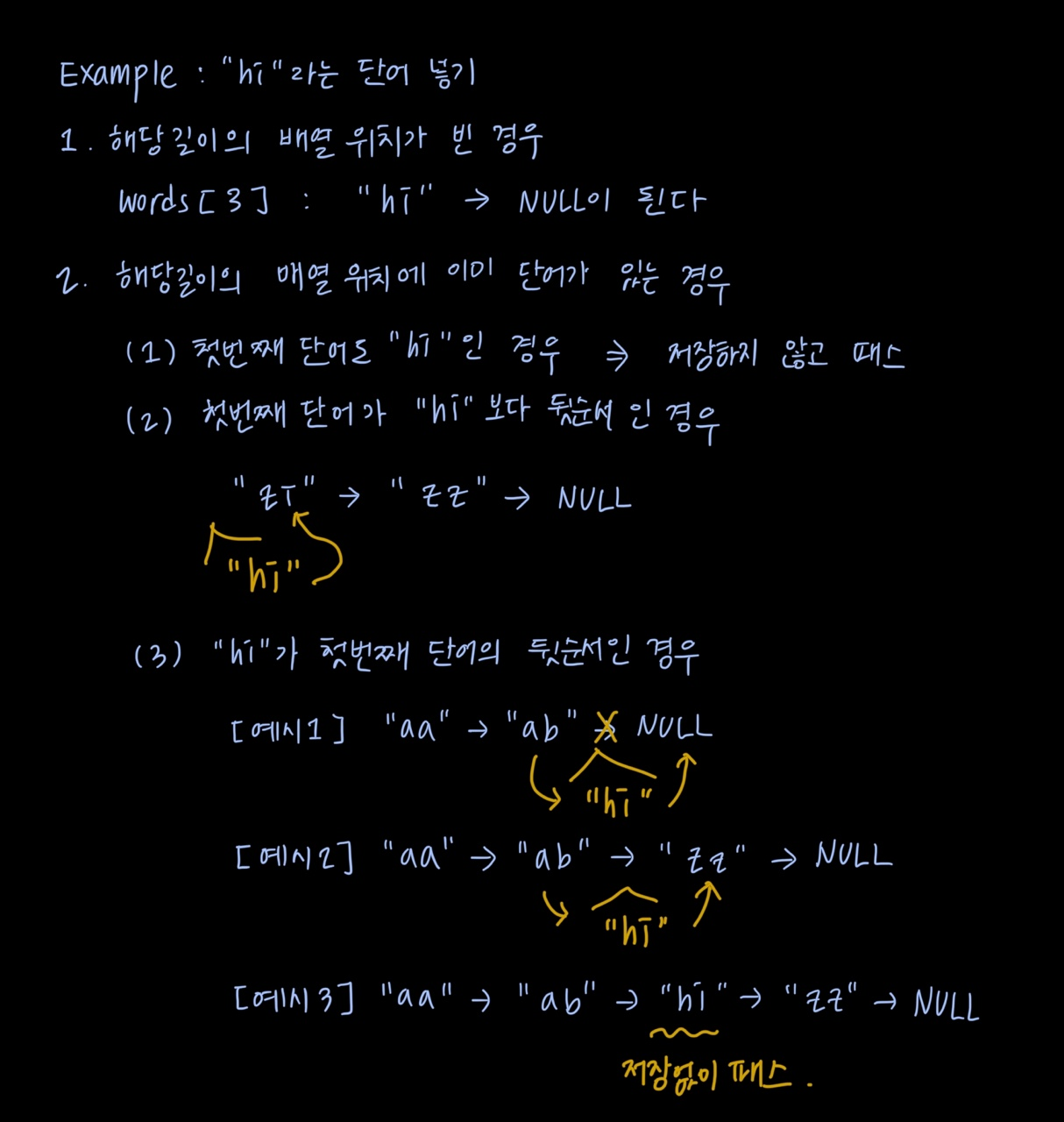 하지만 이미 입력받은 같은 길이의 단어가 있는 경우, 정렬된 올바른 위치를 찾아서 넣어주어야 하므로 조금 더 복잡한 과정을 거쳐야 합니다. 우선 첫 번째 단어를 cur 변수에 넣고, 현재 입력받은 단어와 첫 번째 단어를 비교하여 다시 3가지 경우로 나눕니다. 첫 번째 단어가 현재 입력받은 단어와 같은 경우는 문제에 따라 같은 단어는 하나만 남겨야 하므로 저장하지 않고 바로 continue 해줍니다. 만약 첫 번째 단어가 현재 입력받은 단어보다 뒷순서인 경우에는 첫 번째 단어 자리를 현재 입력받은 단어에게 주고, 기존 첫 번째 단어를 현재 입력받은 단어의 next 노드 자리에 넣어줍니다. 세 번째로 그 외의 경우에는 다시 현재 입력받은 단어의 적절한 자리를 여러 개의 같은 길이의 단어들 사이에서 찾아야 합니다. while문으로 linked list를 순회하면서 계속 현재 단어와 저장된 단어들을 비교하여, 탐색 중인 단어의 다음 단어가 현재 단어보다 뒷순서 거나 같은 경우 순회를 종료하여 위치를 찾습니다. 이때 단어들이 같을 경우 저장하지 않지만, 그렇지 않을 경우에는 탐색을 종료한 시점의 단어 다음 자리를 현재 단어에게 주고, 원래 다음 단어를 현재 단어의 다음에게 줍니다. 말이 복잡해서 아래와 같이 손글씨와 예시로 표현해 봤으니 참고해주시 바랍니다.