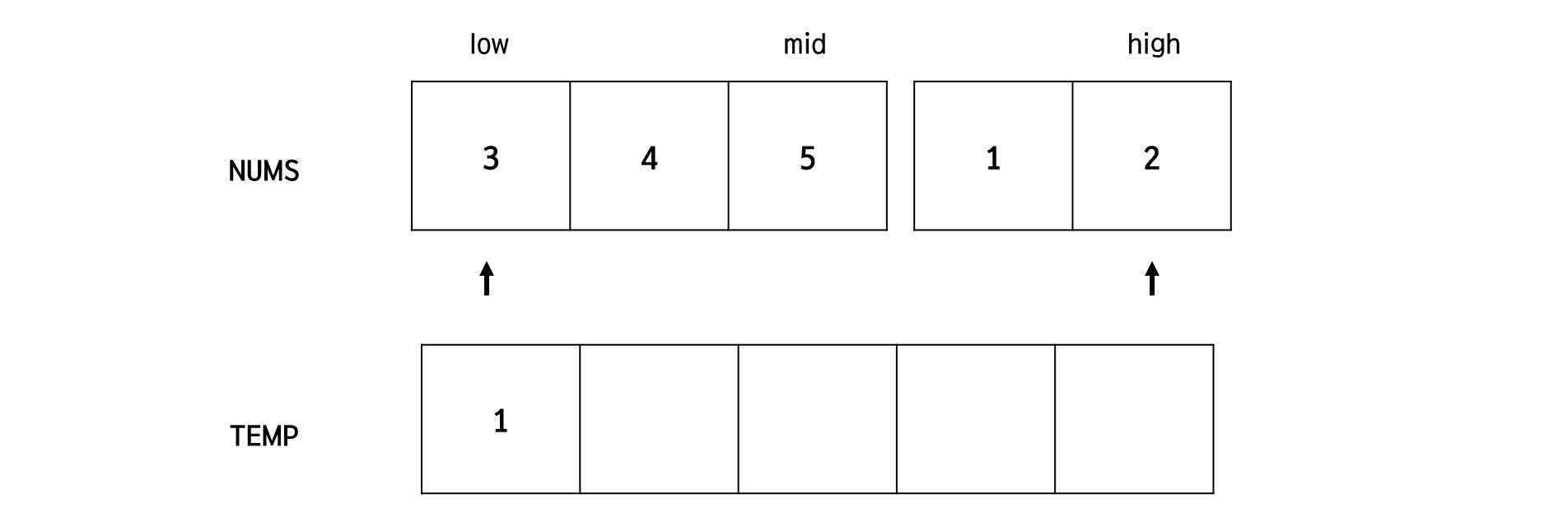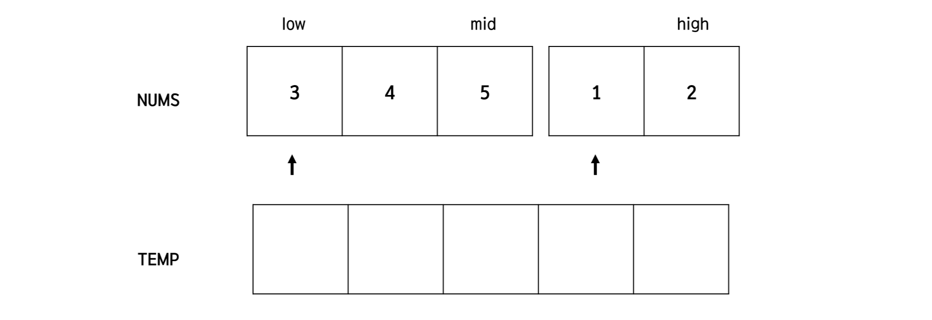 // 왼쪽 파트(low ~ mid)와 오른쪽 파트(mid+1 ~ high)를 순회하며 더 작은 숫자부터 temp 배열에 넣음