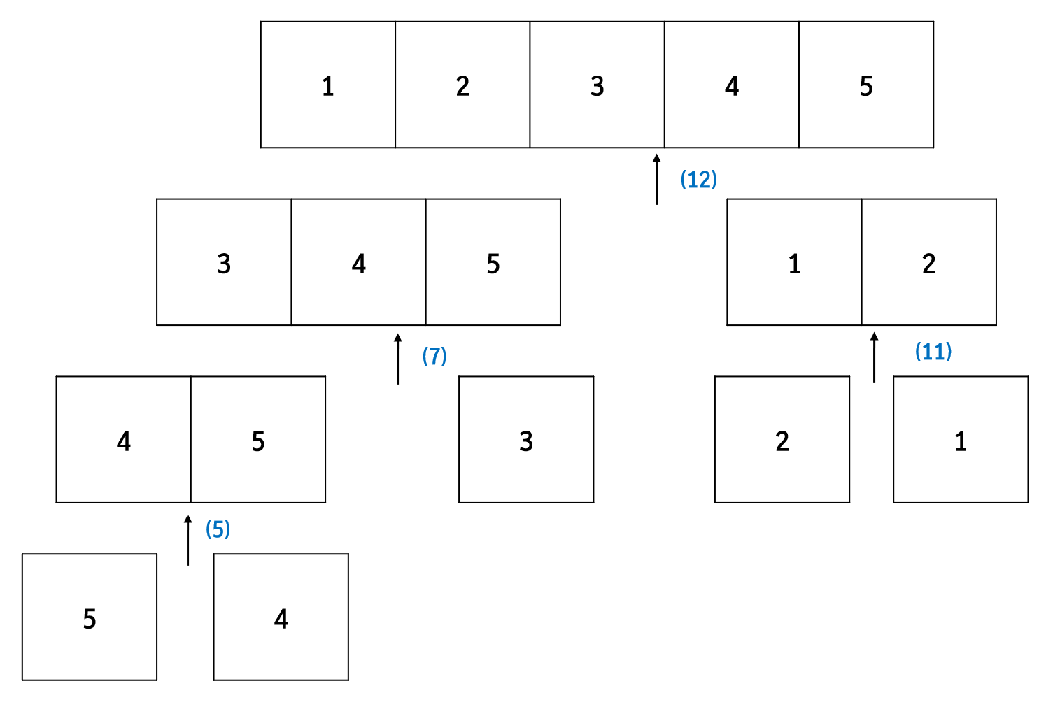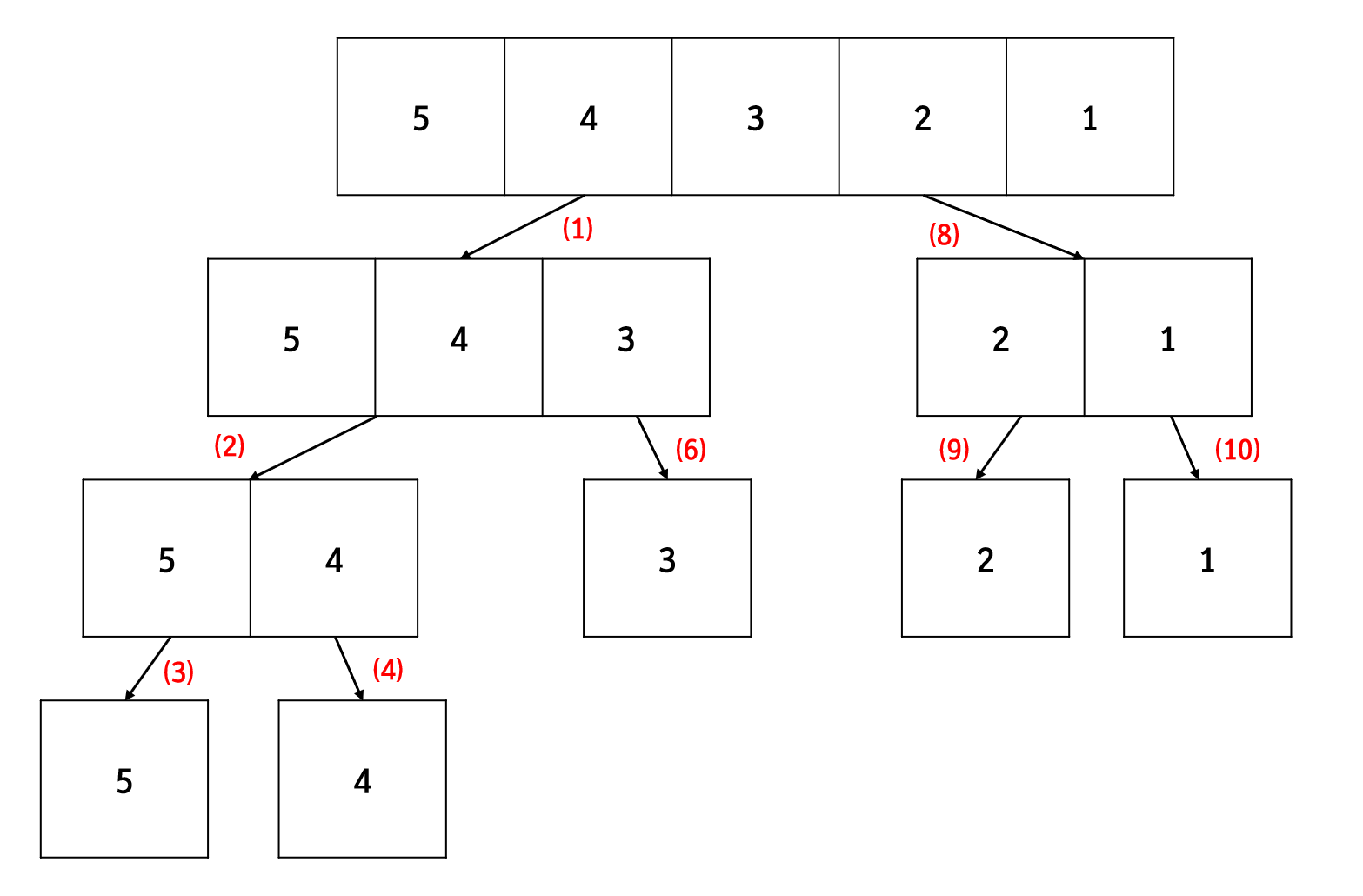아래와 같이 크기가 5인 배열을 원소 하나하나로 쪼개는 것으로 시작합니다. 추후 나올 코드에서는 이것을 재귀함수를 통해 구현합니다.