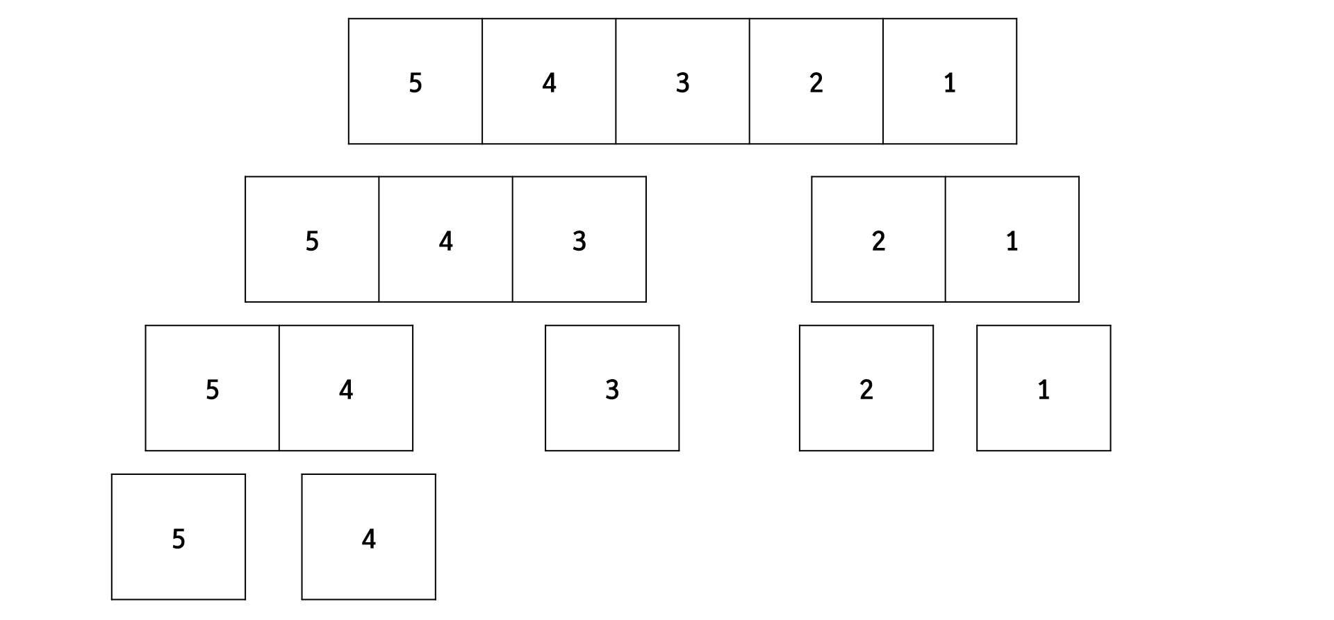 아래와 같이 크기가 5인 배열을 원소 하나하나로 쪼개는 것으로 시작합니다. 추후 나올 코드에서는 이것을 재귀함수를 통해 구현합니다.