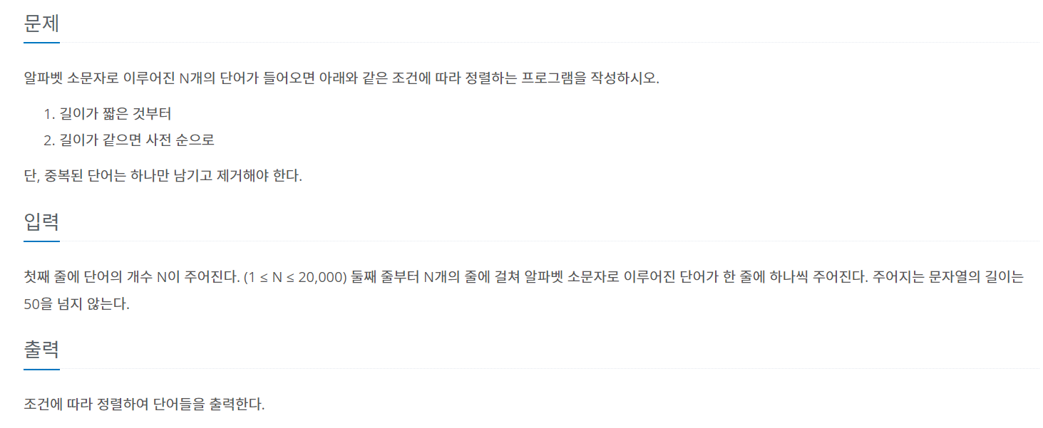 백준 1181번 문제를 hash table과 구조체를 이용하여 풀어보았습니다. 백준 1181번: https://www.acmicpc.net/problem/1181 1181번: 단어 정렬 첫째 줄에 단어의 개수 N이 주어진다. (1 ≤ N ≤ 20,000) 둘째 줄부터 N개의 줄에 걸쳐 알파벳 소문자로 이루어진 단어가 한 줄에 하나씩 주어진다. 주어지는 문자열의 길이는 50을 넘지 않는다. www.acmicpc.net 문제 내용은 아래와 같습니다. 이 문제 역시 정렬하는 것이지만 문자열을 정렬해야 하므로 신경 써야 할 것이 더 많습니다. 우리가 정수를 정렬할 때는 수의 크기 하나만 신경 쓰지만 여기서는 두 가지 요소 모두를 신경 써줘야 하기 때문에 더 복잡할 수 있습니다. 그래서 구현할 때 두 가지 요소 ..